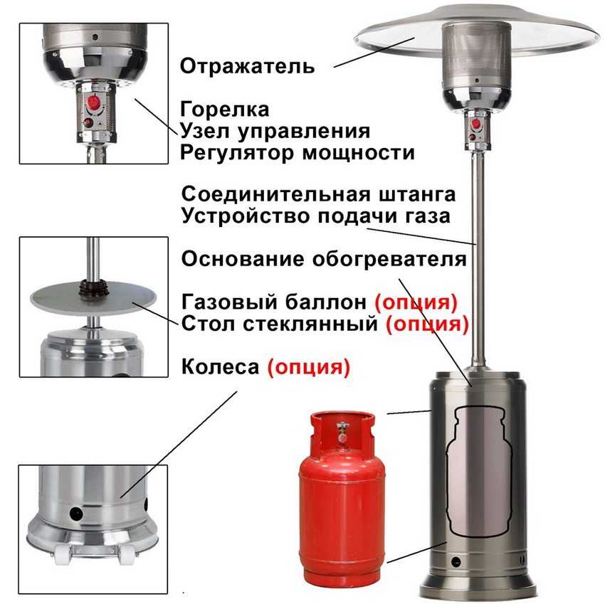 Баллон со сжиженным углеводородным газом объемом 27 литров помещается в цилиндрический отсек у основания прибора. Горелка находится в верхней части. Она защищена от осадков конусным козырьком, который дополнительно играет роль отражателя тепловых волн. Конструкция разборная, что упрощает транспортировку и монтаж изделия.