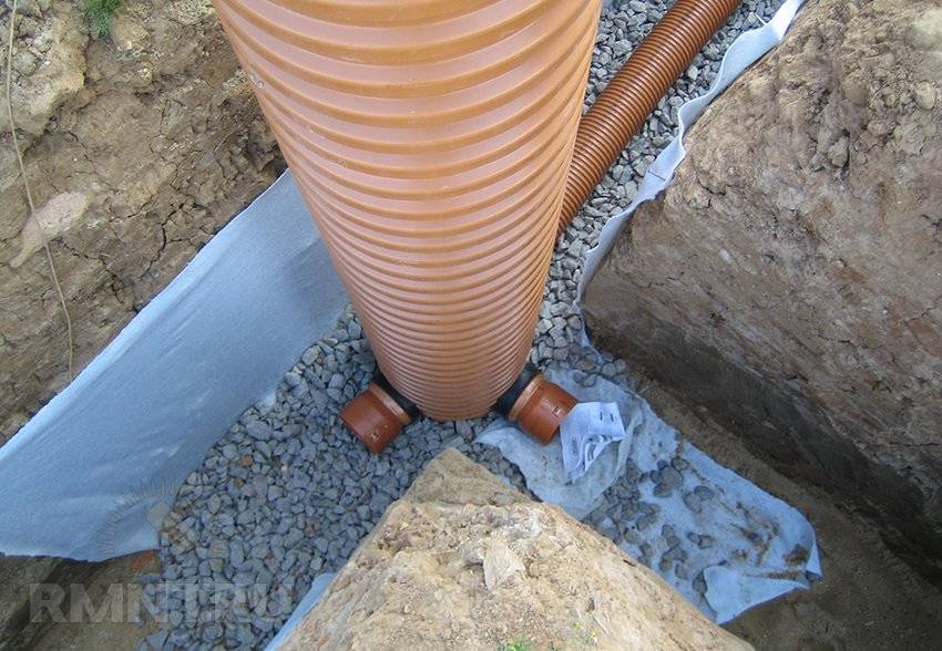 По периметру здания закапываются перфорированные дренажные трубы, в местах соединения которых устанавливаются смотровые или технические колодцы. Вокруг элементов дренажной системы укладывается выстилка из гигроскопичного материала — щебня или керамзита. Вода, просачиваясь в отверстия труб, поступает по ним к колодцам, затем по трубам большего диаметра в коллектор и центральный водосток. Отвод осуществляется в дренажную траншею, вода также может быть равномерно сброшена на сухой участок почвы.