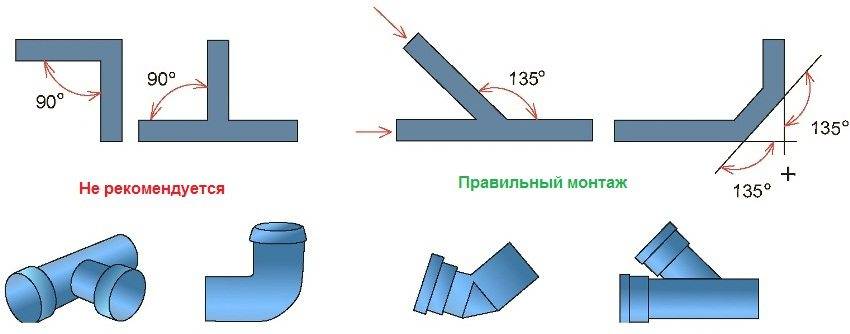 Не рекомендуется стыковать трубы канализации под углом 90°