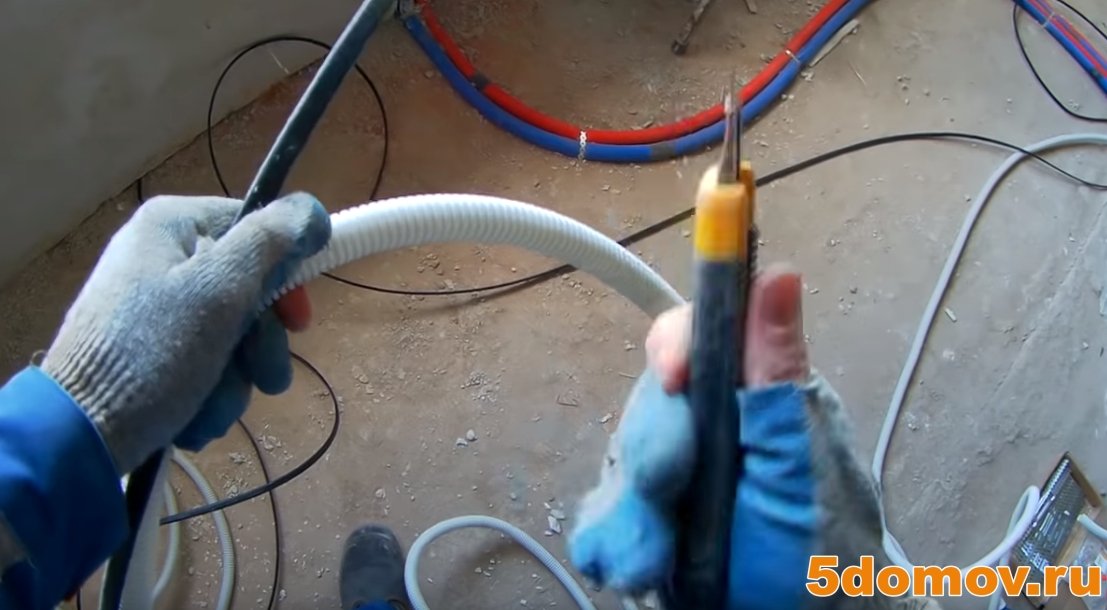 Удобство применения гофры состоит еще и в том, что защита кабеля производится без специальных инструментов и не требует особых усилий. Понадобятся только внутренний зонд и инструмент для нарезки, после чего кабель укладывается в подготовленные бороздки (штробы).