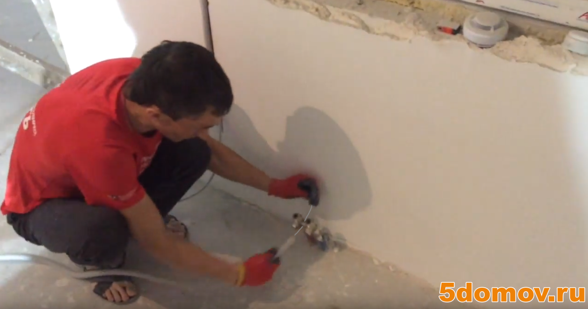 Отмерьте рулеткой и отрежьте необходимое количество гофротрубы. Резать лучше всего канцелярским ножом. Будьте аккуратны – внутри трубы находится проволока. Ее нужно перекусить бокорезами при этом, придерживая, чтобы после перекуса проволока не утонула внутри гофры. Если это произойдет, достать протяжку получится только подрезая трубу на необходимую длину. Конец проволоки нужно соединить с кабелем. Сделать это проще всего, аккуратно загнув струну крючком и пробив край изоляции (на видео ниже наглядно показана эта технология). Альтернативный способ – просто обернуть несколько раз струну вокруг кабеля. После этого нужно обязательно заизолировать место соединения, чтобы выступы не цеплялись при протяжке проводника. Свободный конец протяжки нужно надежно зафиксировать. Если вы работаете вдвоем с напарником, ему просто необходимо придержать проволоку. Если вы выполняете электромонтаж самостоятельно, можно закрепить протяжку на батарее, дверной ручке либо другом неподвижном объекте. Цель крепления – в дальнейшем создать натяжение, чтобы было удобнее протянуть кабель в гофре. Последнее, что осталось – затянуть провод внутрь на всю длину