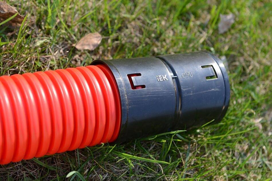 Здесь не обойтись без труб из полиэтилена низкого давления (ПНД) или полиамида. Это материалы, устойчивые к морозам, влаге, агрессивным веществам и ультрафиолетовому излучению. Они защищают кабель при прокладывании от повреждений, выполняют функцию защиты от возгорания.
