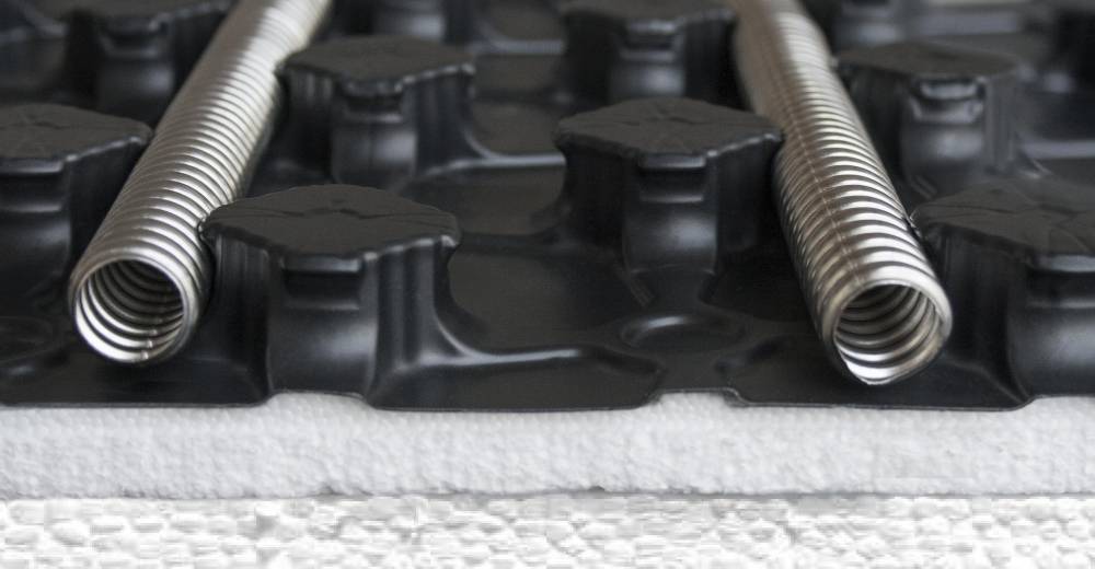 Помимо нержавеющей стали, гофротруба может быть изготовлена из пластика или чугуна (изделия с внешним оребрением). Пластиковые гофрированные трубы – не лучший вариант в качестве трубопровода для прохождения теплоносителя. В системах отопления они чаще используются как дополнительная защита для основных коммуникаций, например, проходящих в цементной стяжке. Чугунные гофротрубы хорошо выдерживают тепловые нагрузки, но постепенно отходят на задний план из-за большого веса и сложности монтажа.