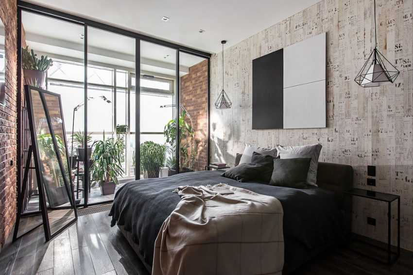На более просторных территориях можно расположить большую двухместную кровать, а также кожаный диван с кофейным столиком и телевизором напротив. Зону гостиной и спальни в подобных условиях можно разграничить с помощью гипсокартонной конструкции, представляющей собой небольшие квадратные полочки.