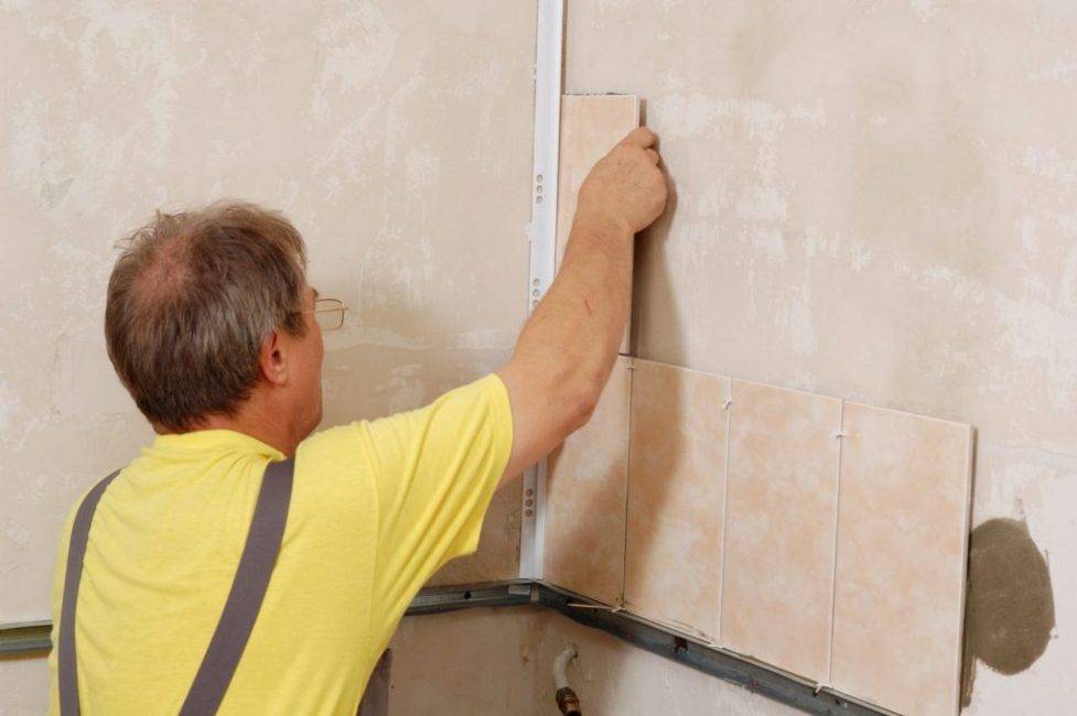 - Чтобы плитка не съезжала вниз (если она начинается не от пола), под нижний край временно прикрепите алюминиевый профиль