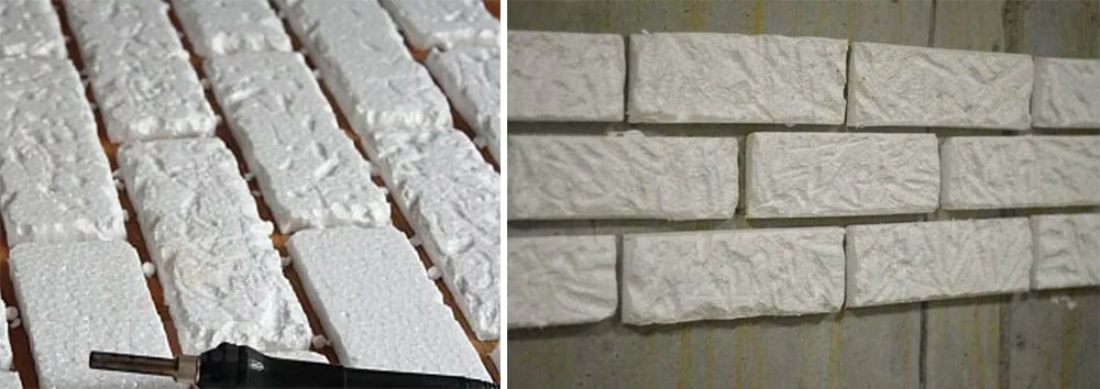 Плюсами данного способа являются легкость в резки и обработки пенопласта, небольшое количество пыли при проведении внутренних работ. Пенопласт дешевле штукатурки и хорошо крепится к рабочей поверхности. Однако у него есть и свои недостатки – он имеет небольшую ударопрочность, что позволяет ему легко откалываться и деформироваться при ударах. Чтобы избежать возможной деформации, можно взять плотный мелкозернистый пенопласт. Он не так подвержен изломам и не крошится при резке, что обеспечит прямые углы у каждого кирпичика.