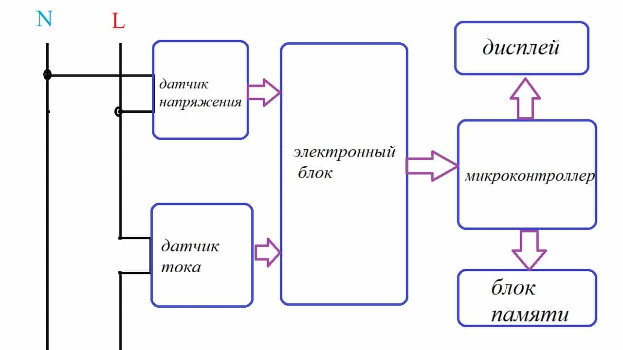 - преобразователь (преобразует аналоговый сигнал в цифровой с последующим преобразованием его в импульсный сигнал, равнозначный потребляемой энергии)