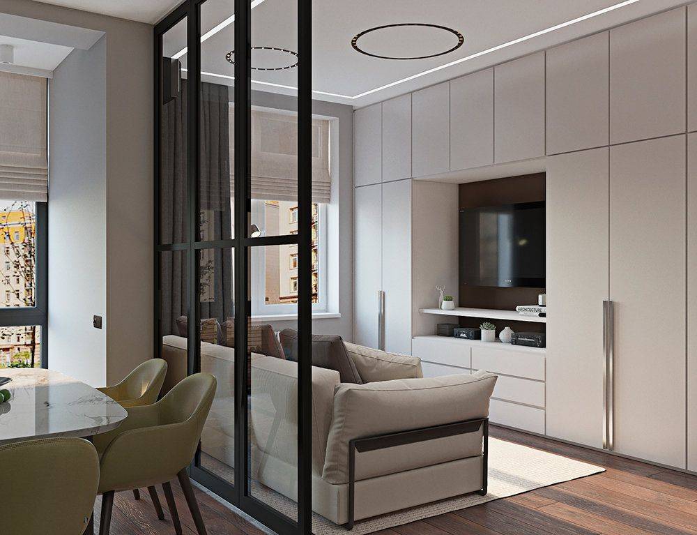 Так как при организации двух зон буквально каждый сантиметр на счету, то можно задействовать дизайнерские приемы по экономии пространства: