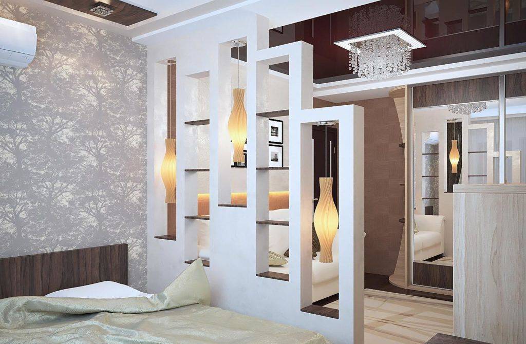 Мебель тоже может играть роль разделителя. Эту роль в интерьерах часто играет высокая спинка кровати или стеллаж. А самое основательное зонирование способен дать обычный шкаф или шкаф-купе.