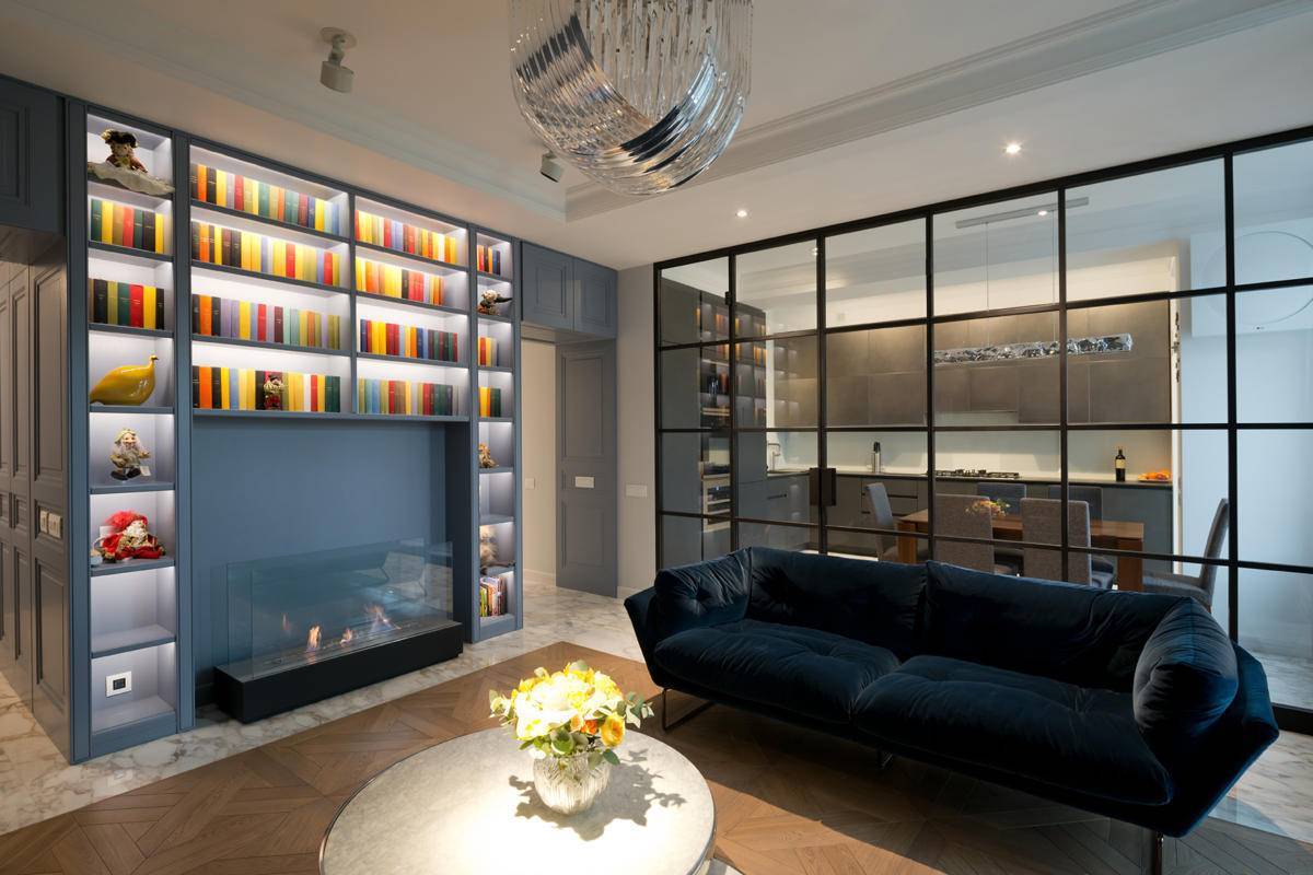 Перегородки для зонирования кухни и гостиной из стекла
