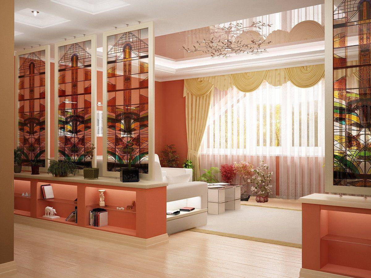 Интересной формой внутренней перегородки является стена из стекла. Материал может быть полностью прозрачным, матовым или с декоративным рисунком. Такая поверхность визуально разделит гостиную, при этом украшая ее.