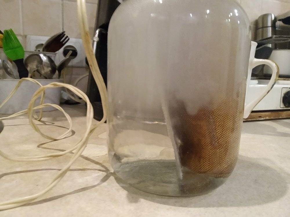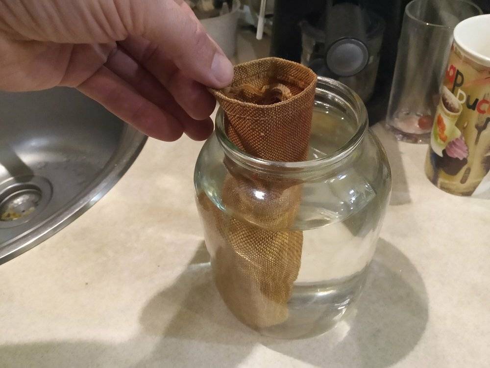 Теперь наливаете воду в мешочек и погружаете его в банку. Непокрытый водой мешочек должен выступать над уровнем воды на 1-2 см – чтобы воды не смешивались.