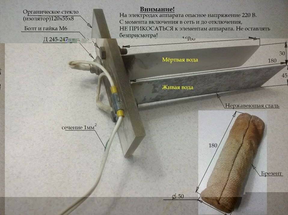 Прибор работает от сети переменного тока 220В. Непосредственно для приготовления воды нужен постоянный ток. Поэтому, в цепи питания одного из электродов установлен мощный диод. Два электрода из нержавеющей стали закреплены на изолирующей основе из органического стекла.