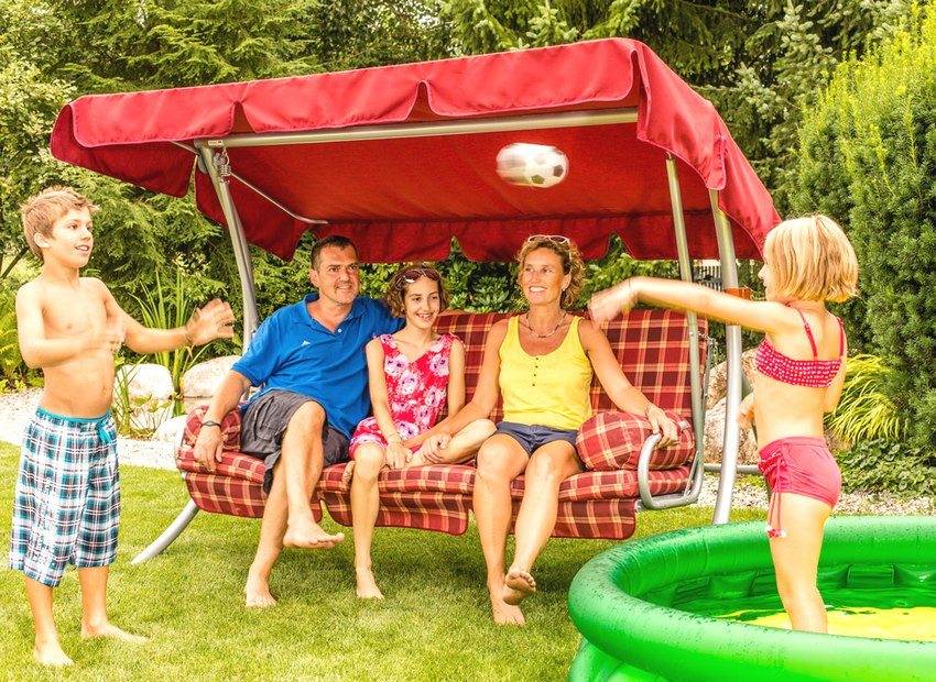 семейные – изделия с массивной и увесистой конструкцией. По своему устройству они напоминают скамейки без ножек с большой и высокой спинкой. За счет больших габаритов на сиденье может уместиться вся семья. Чтобы эксплуатация подобных качелей была безопасной, их надежно закрепляют на раме П-образной формы. В качестве фиксаторов используются прочные тросы или толстые цепи. Если организовать над качелями крышу или тентовый навес, ими можно пользоваться даже под дождем;