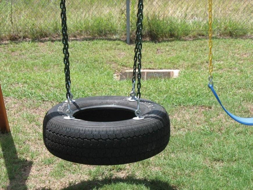 Для мастеров на все руки можно предложить вариант качели, изготовленной по готовому шаблону (можно найти в интернете). Из покрышки вырезается сиденье для качелей в виде птицы или животного и подвешивается на канатах или цепях.