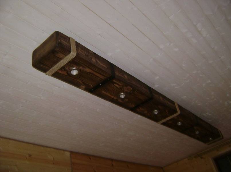А если немного помудрить, можно сделать не подвесную люстру, а вот такой потолочный светильник, уложив провода в канавки, вырезанные на тыльной стороне деревянных плашек.
