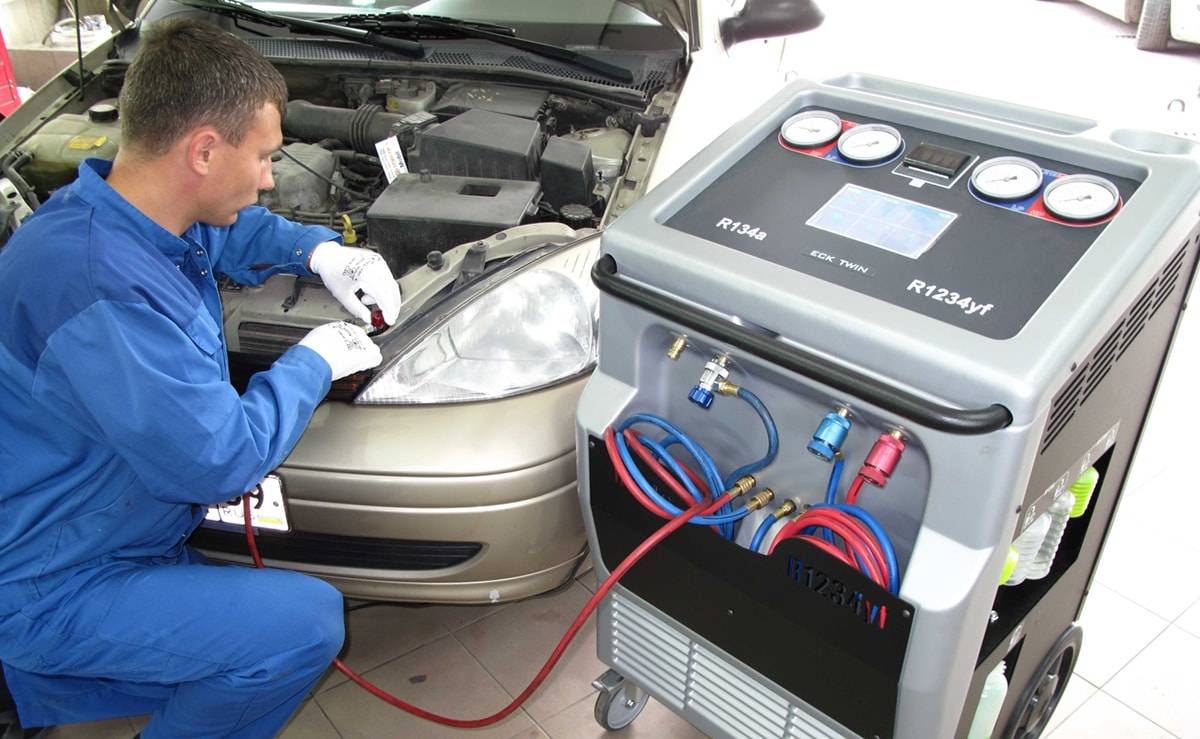 После диагностики магистралей и узлов на течь заправку автокондиционера выполняют специальным оборудованием.