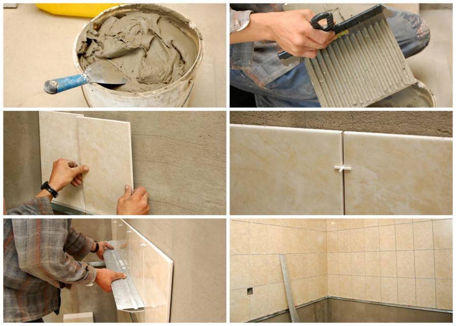 - Понимание, как правильно класть плитку обеспечит качественное выполнение работ. Важным моментом является перпендикулярное размещение борозд от шпателя на стене и на плитке, что обеспечивает монолитность слоя клея, а также отсутствие пустот под облицовкой.