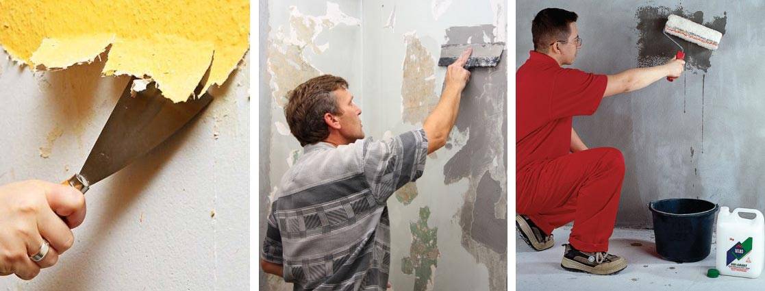 - Старое покрытие удаляют. Подходящий способ зависит от вида материала. Бумажные обои нужно обильно смочить, а краску удаляют механическим методом.
