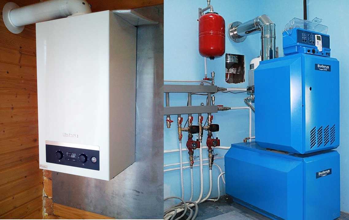 По типу монтажа различают два типа газовых котлов: напольные и настенные. Настенные работать могут только с природным газом, напольные — с двумя типами голубого топлива. Плюс настенных газовых котлов в том, что их можно устанавливать в кухнях — они автоматизированы и безопасны. Некоторые напольные тоже могут устанавливаться на кухне (мощностью до 60 кВт), но это помещение должно отвечать определенным требованиям.