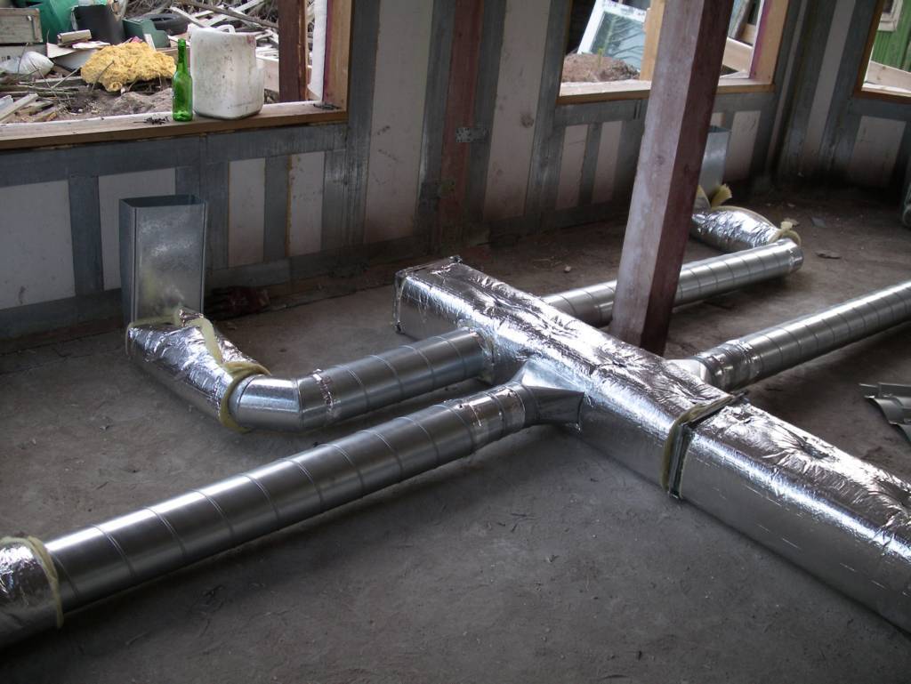 В тех случаях, когда в доме предполагается использование кондиционеров, воздуховоды необходимо дополнительно утеплить. В противном случае на их поверхности будет скапливаться конденсат. Для изготовления воздушных каналов обычно применяется оцинкованная сталь: такую поверхность проще всего утеплять самоклеющимися теплоизоляционными материалами. Для соединения между собой жестких и гибких участков используются хомуты и армированный скотч. Чтобы предотвратить появление свищей, все стыки желательно дополнительно обработать герметиком.