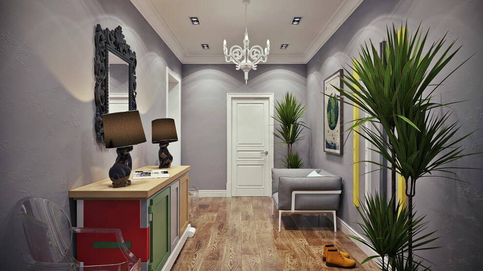 Комбинирование с помощью материалов. Этот способ считается очень модным у дизайнеров. Отделка проводится различными материалами. Например, рядом с кирпичной кладкой в коридоре уместно поклеить обои. Все это в небольшом количестве можно приобрести на распродаже по низким ценам. Причем интерьер получится очень стильным.