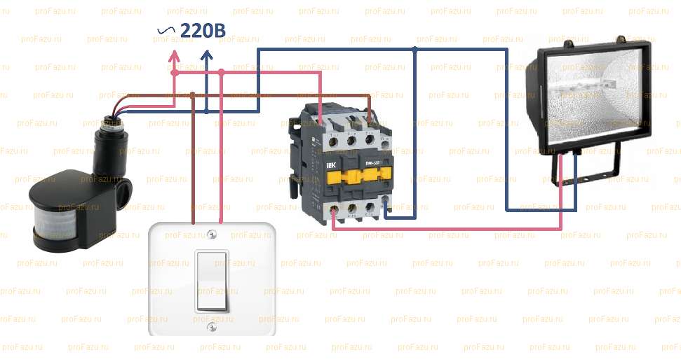 Если контактная система сенсора движения не позволяет коммутировать полную нагрузку прожектора, потребуется включить ее через реле-повторитель, в качестве которого можно использовать пускатель.