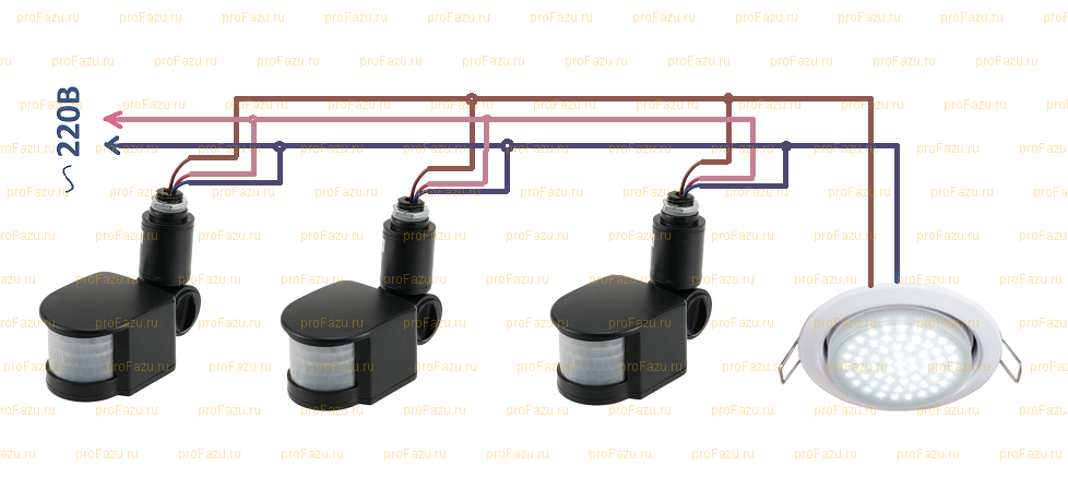 Здесь датчики объединены между собой фазным проводом от сети. Нулевой провод поступает на все сенсоры и светильник или сигнализацию без промежуточной коммутации