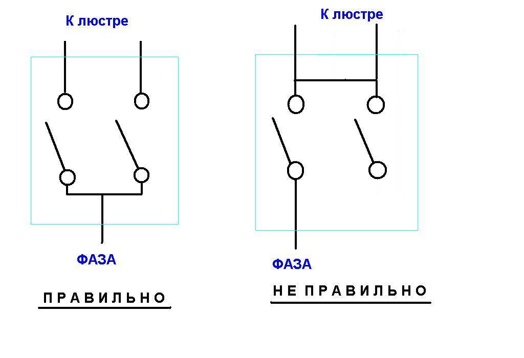 Трубка не является обязательным элементом, но она здорово облегчит ремонт, если проводка сгорит. Также периодически нужно затягивать фиксирующие болты Нельзя скручивать друг с другом алюминиевые и медные провода — формируется гальваническая пара, которая даже при незначительном повышении уровня влажности в квартире может воспроизводить электрохимическую реакцию в виде окисления. Число контуров определяется при креплении 1 щупа тестера на фазе, и поочередном касании к среднему фазному контакту остальных патронов 2 щупом. Ошибки при подключении двухклавишного выключателя Первая ошибка которую может допустить неграмотный специалист — это завести на выключатель не фазу, а ноль.