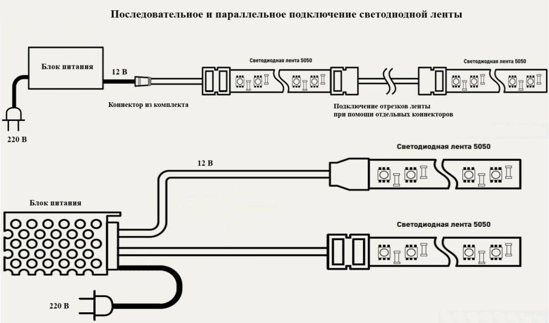 Запомните. Участки ленты, длиной больше 5 метров, должны подключаться только параллельно.
