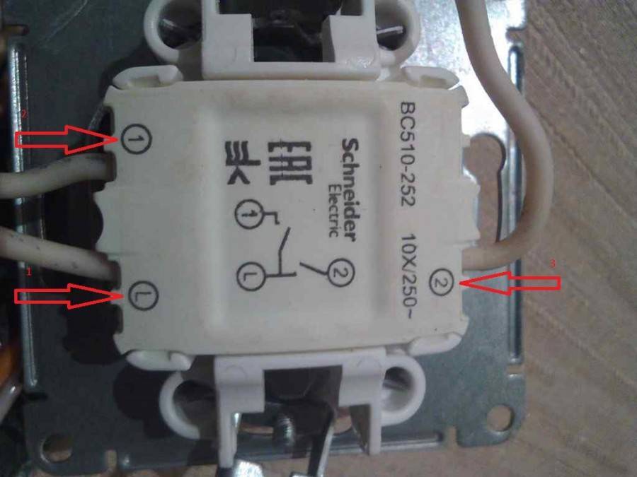 - Разобрать выключатель. Механизм несколько отличается от одноклавишного. Но в этом нет ничего страшного: в современных выключателях все контакты маркируются. L — контакт для питающей фазы, отходящие контакты обозначены стрелками вниз.