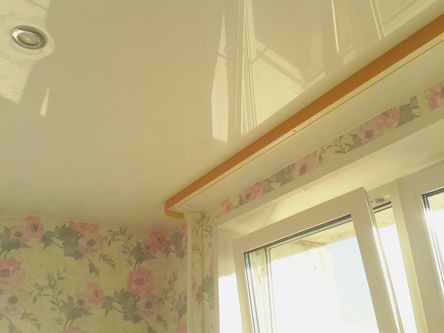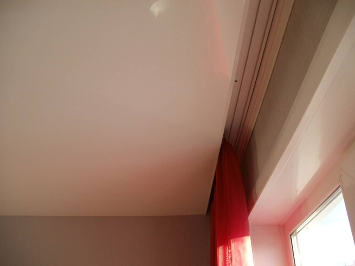 - Перегиб полотна до потолка. Перегиб выполняется до бетонного основания, для чего также используются специальные профили из пластика или алюминия. В результате все детали надёжно прячутся под безупречно ровное полотно без намёка на зазор. Способ желателен, если, например, окно выходит на балкон. Минус только один – существует вероятность повредить полотно во время эксплуатации.