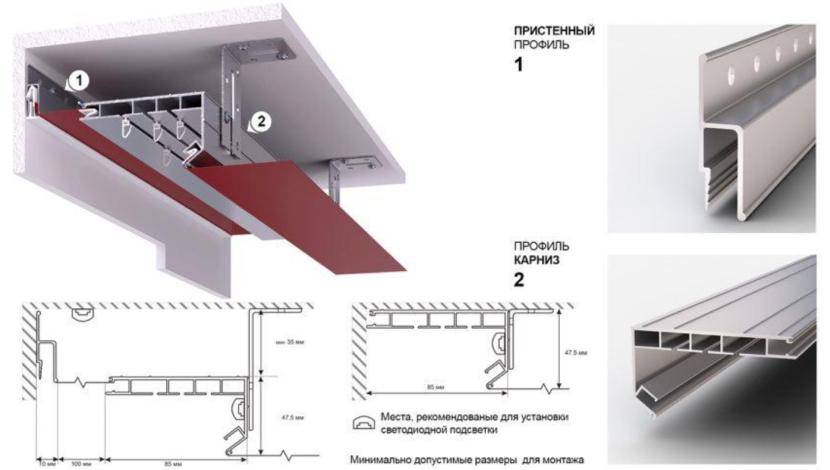 В других случаях в конструкции натяжного потолка формируют нишу. Натяжные потолки с нишей для штор могут выполняться несколькими способами. Технические решения отличаются степенью сложности, что влияет на сроки изготовления и стоимость. Возможны следующие варианты карнизных углублений (в порядке удорожания):