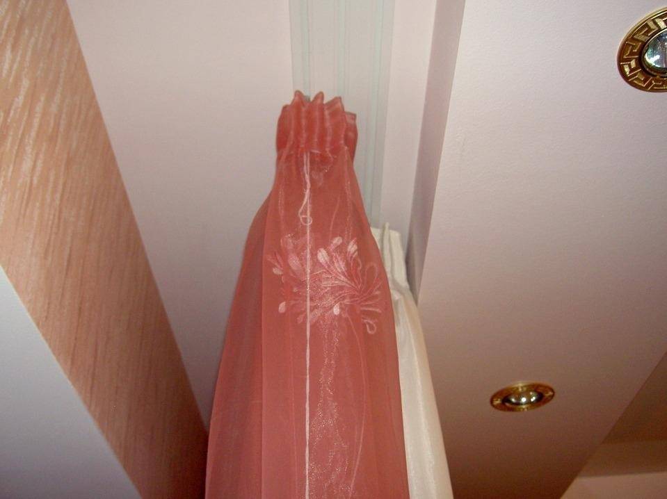 Гибкие потолочные карнизы очень удобны для сложных по геометрии оконных проемов, эркеров, террасных и балконных козырьков. Кроме того, они используются для зонирования помещений при помощи занавеса, в качестве балдахина в зоне отдыха или шторы в ванной комнате.