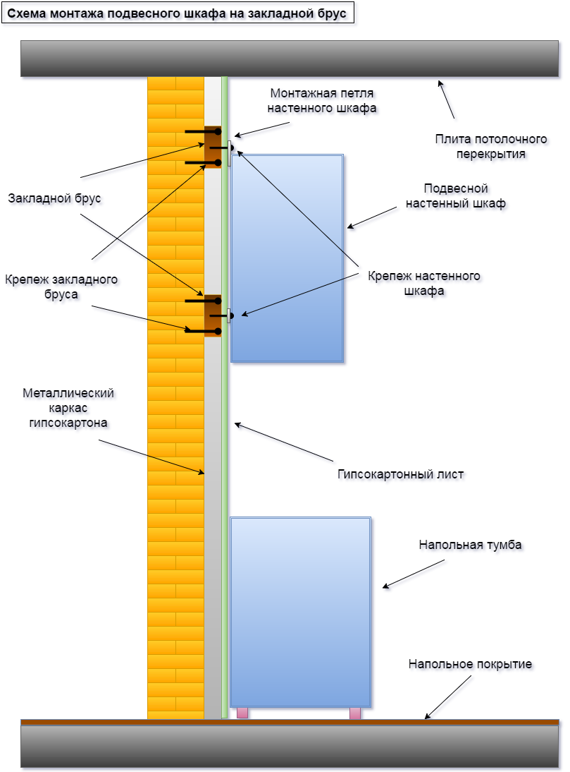 Здесь тоже есть несколько способов, которые позволят выполнить достаточно надежное крепление кухонных шкафов на гипсокартон.