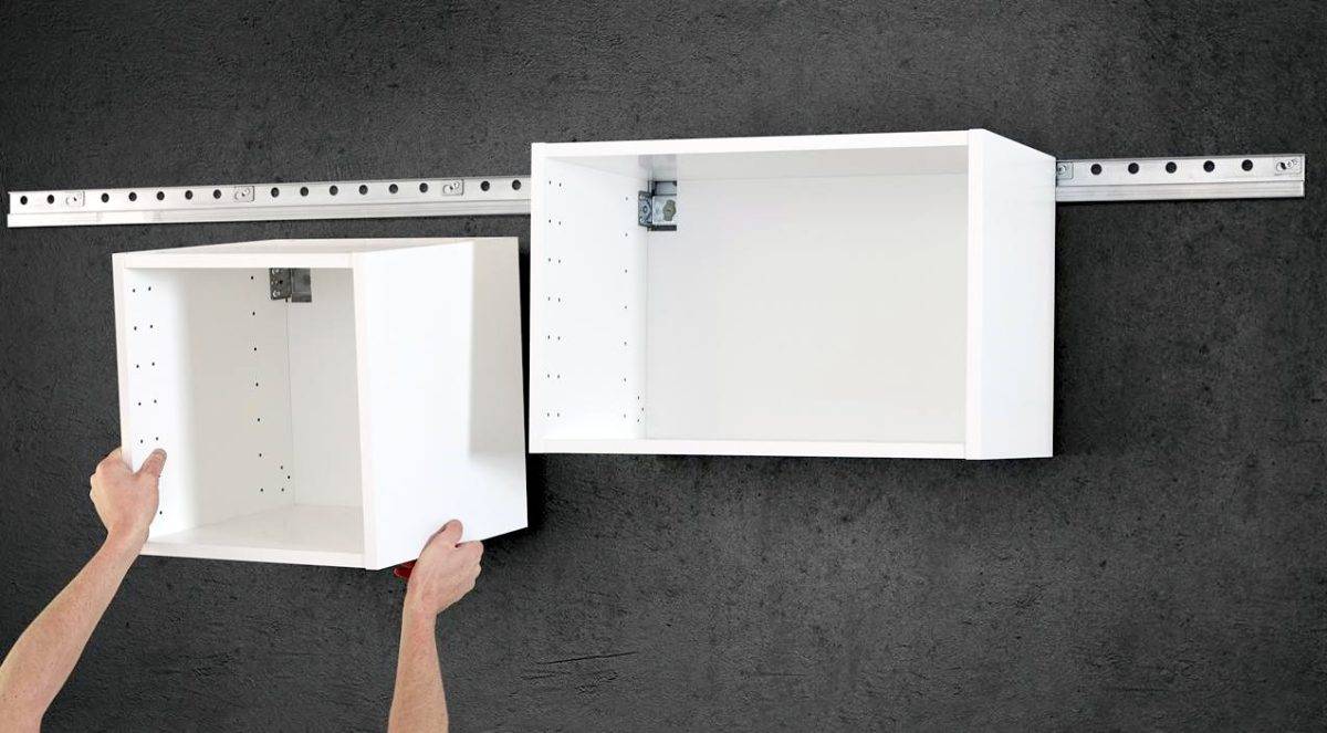 С этим способом больше не возникнет вопрос: как повесить кухонные шкафы на стену из гипсокартона, когда она уже обшита. При помощи горизонтальной шины шкафчики вешаются на одном уровне.
