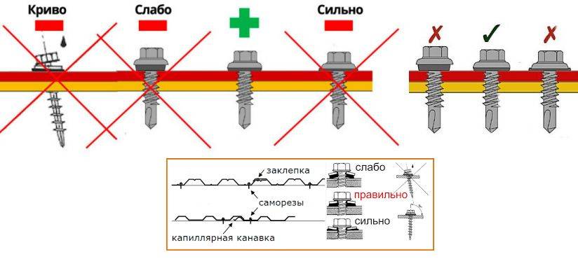 Длина саморезов должна соответствовать толщине профилированных листов, поэтому крепежи должны подбираться грамотно под материал.