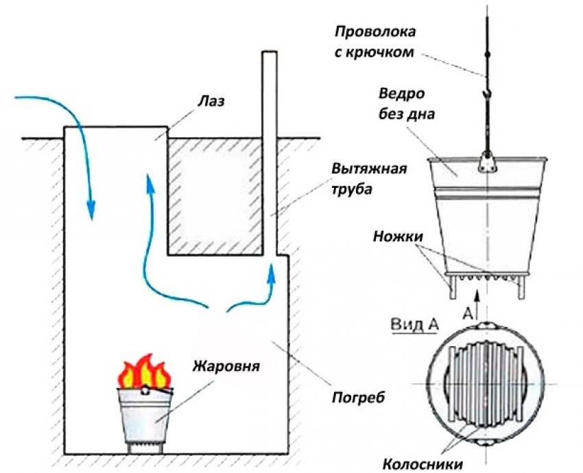 При помощи железной печки или жаровни – в подвал опускается жаровня или ведро с углями, огонь поддерживается до тех пор, пока в помещении не станет достаточно сухо. Перед началом такой сушки в погребе необходимо открыть дверь и другие отверстия. Огонь лучше всего разжигать при помощи древесных опилок или щепок, а при необходимости операцию можно повторить несколько раз.