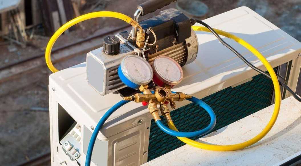 - Присоединить к контуру вакуумный насос, чтобы выкачать из системы остатки старого фреона, влагу, грязь, воздух и т.п.