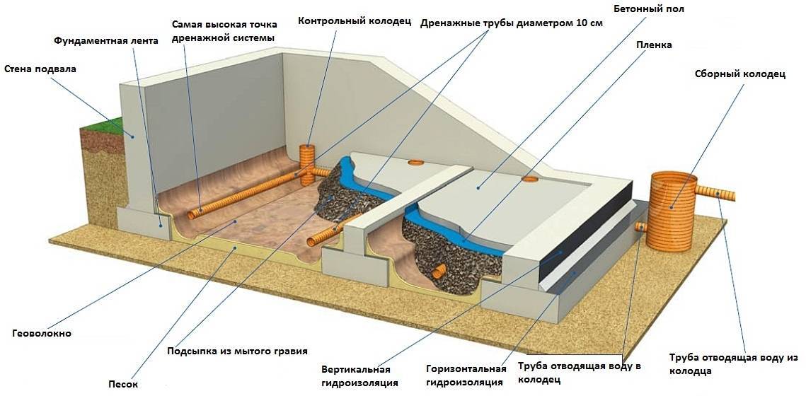 - Можете дополнительно по внешнему периметру подвала, в траншею, вырытую на глубину фундамента, заложить дренажные трубы, по которым вода будет отводиться в сливную яму или септик.