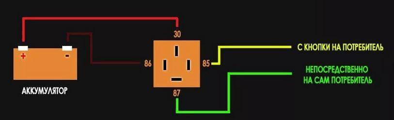 ■ 30 “+” постоянное напряжение от АКБ.■ 85 “+” от кнопки управления реле.■ 86 “—” (земля, масса).■ 87 “+” цепь идущая к исполнительному устройству при срабатывании реле (клаксон, стартер и т.д.)
