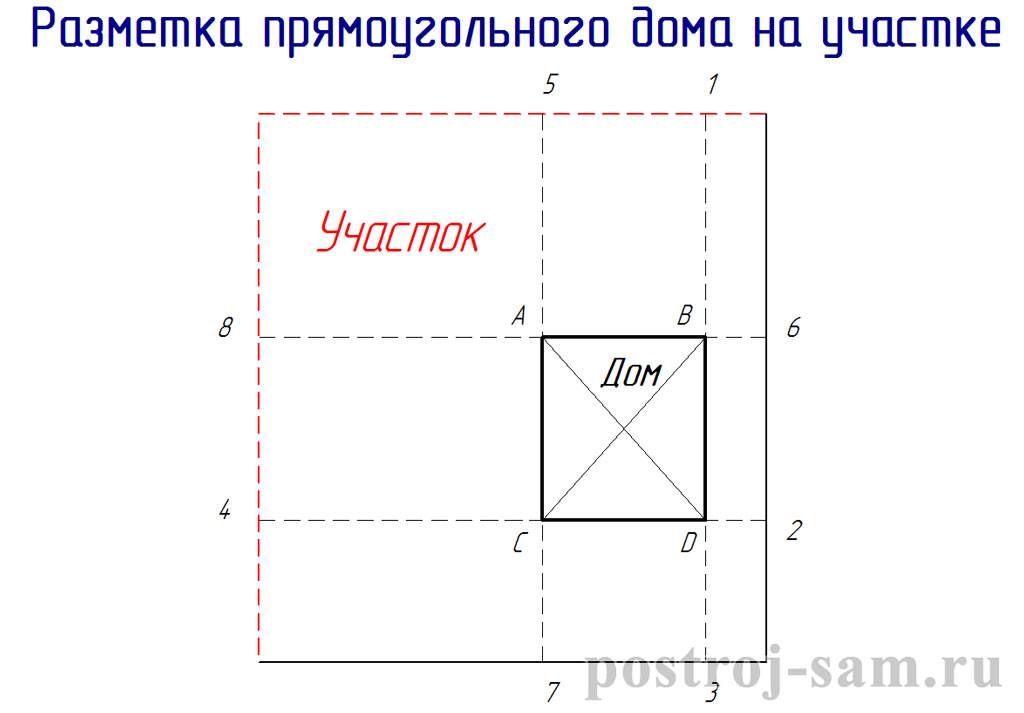 Начнем с самого простого примера, когда участок, как и дом, имеет прямоугольную форму (см. схему выше). Не имея специальных, дорогостоящих инструментов под рукой, на мой взгляд, самый простой способ произвести разметку фундамента будет следующий: