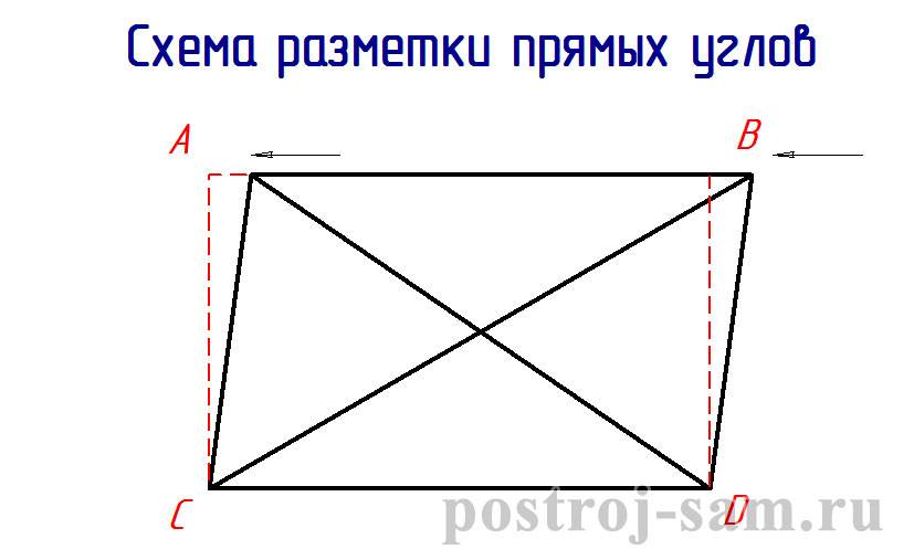 Если Вы все сделали правильно, то расстояние от точки A до точки D, должно быть равно расстоянию от точки B до точки C. Другими словами – диагонали прямоугольника должны быть равны (менее 1 см – допустимая разница).