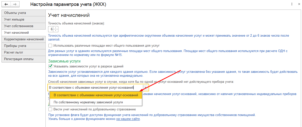 Для этого в настройки параметров учета ЖКХ добавлена возможность выбора способа начисления зависимых услуг: