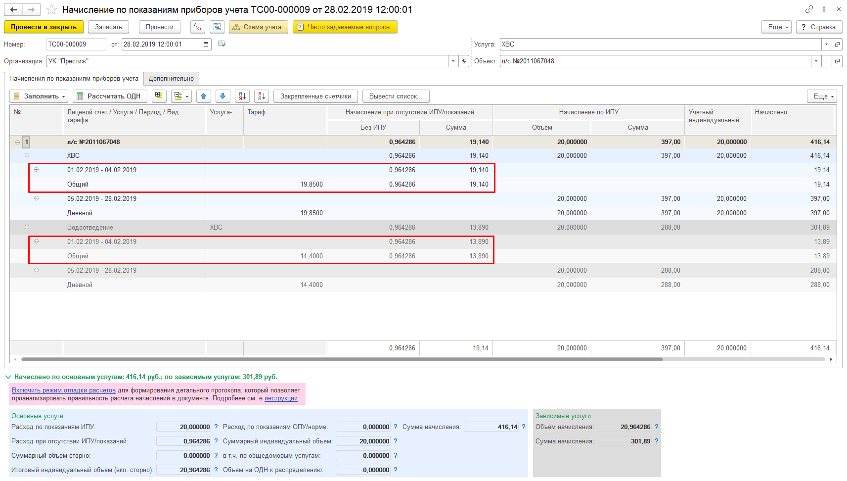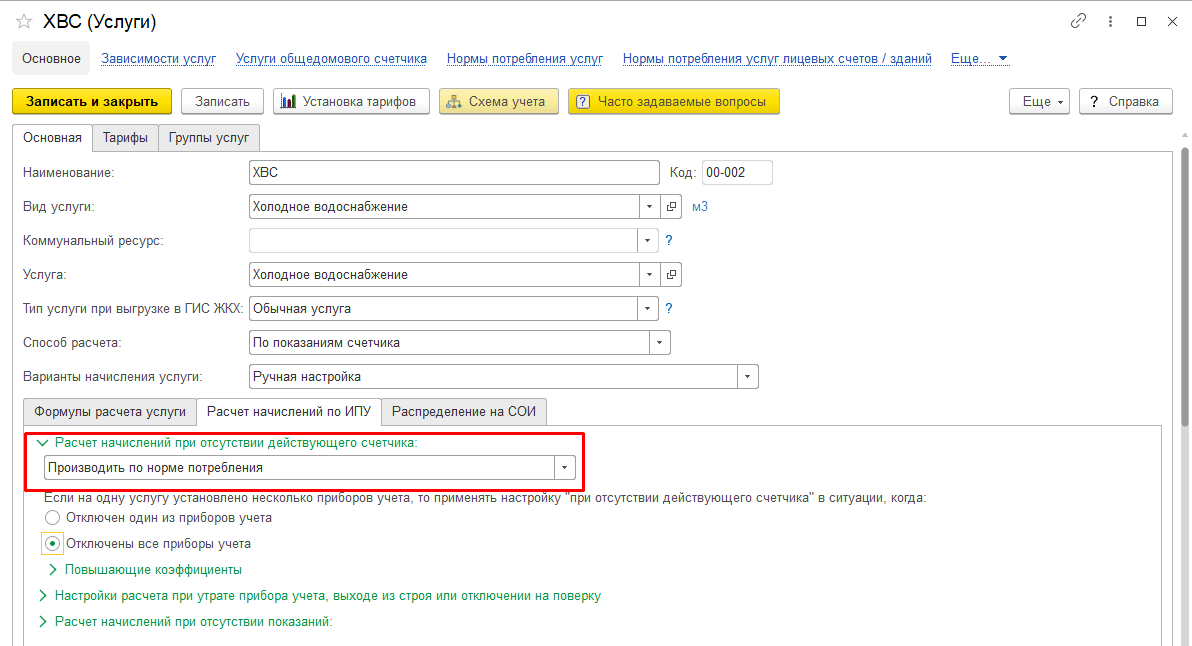 Начисление же зависимых услуг по собственному нормативу, за те периоды, когда отсутствуют приборы учета, выполняется вместе с начислениями услуг, со способом расчета не по показаниям счетчика.