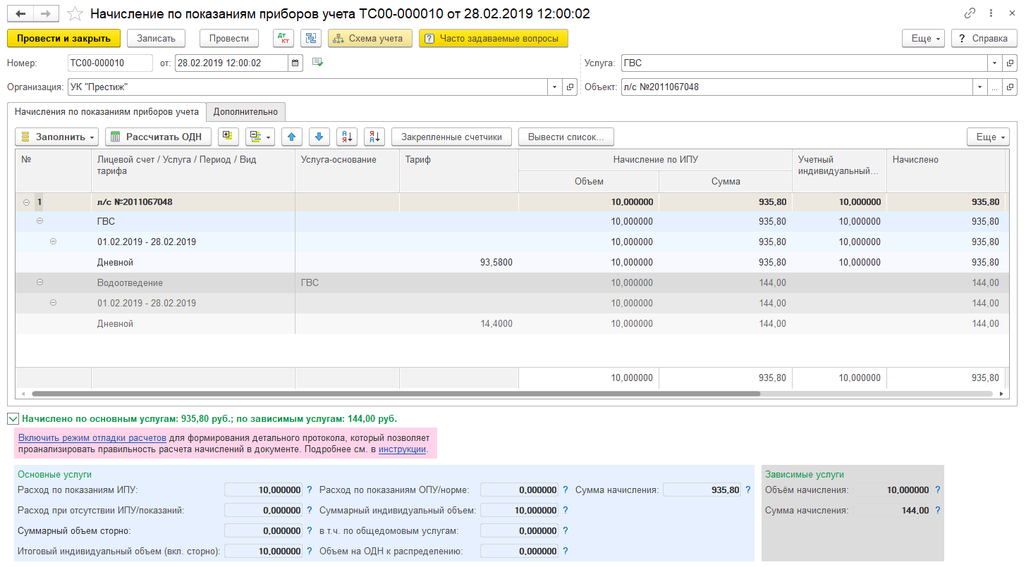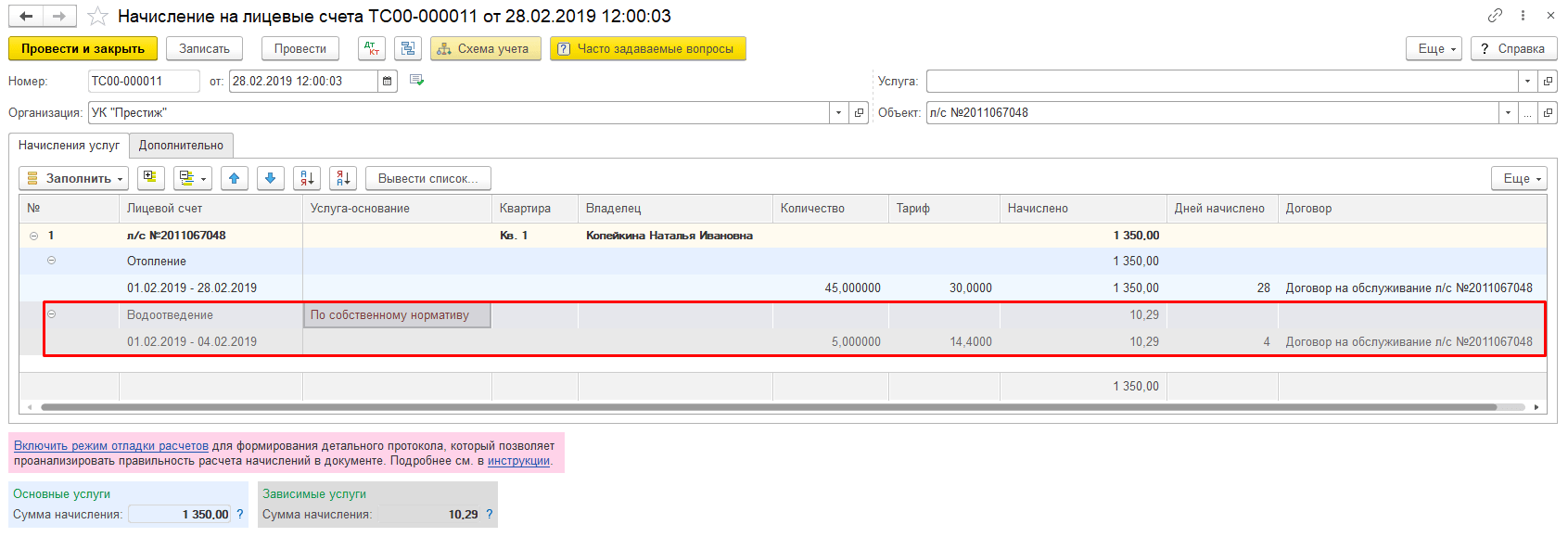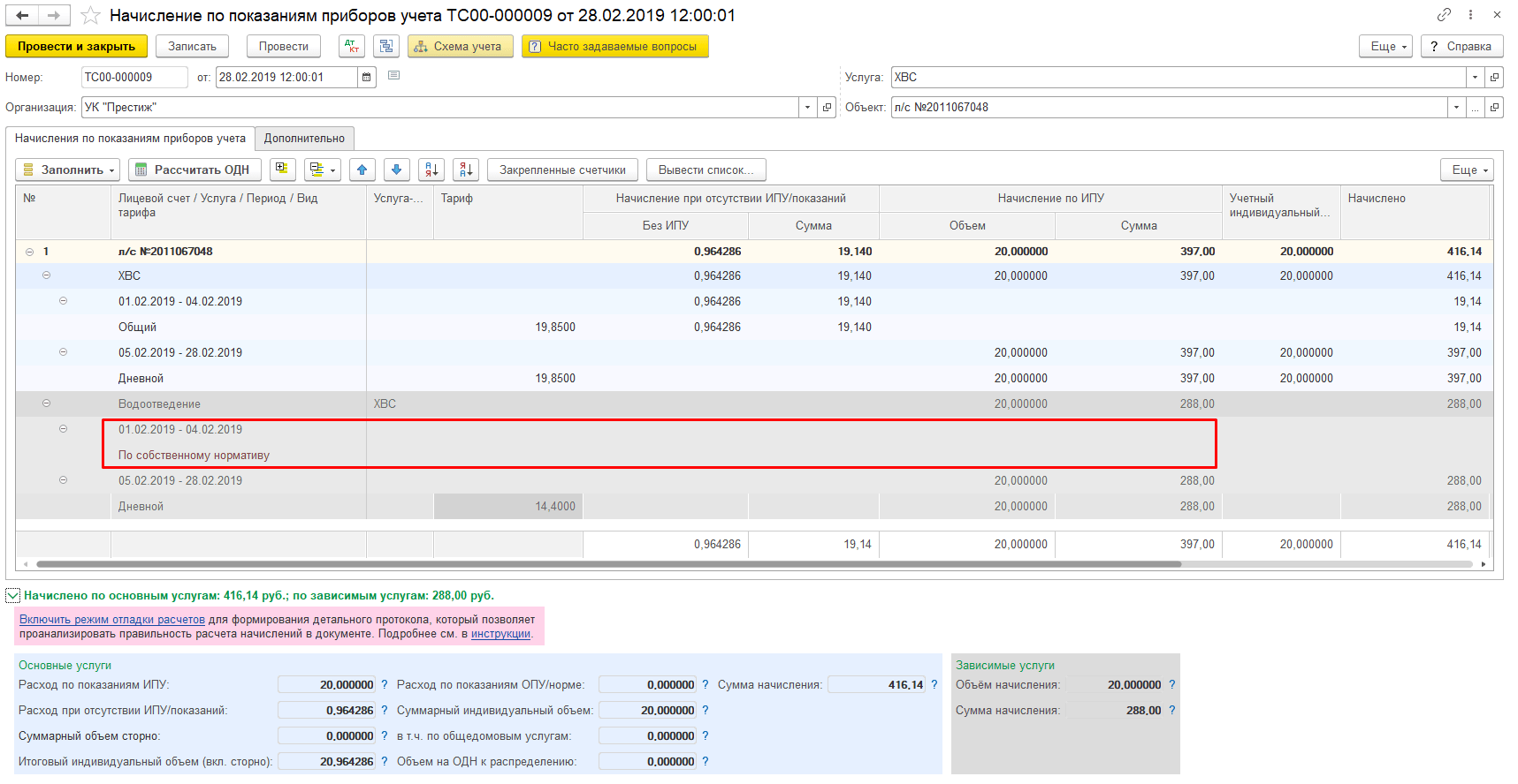 При этом для таких начислений в документе начисления основных услуг зависимая услуга в период, когда отсутствуют приборы учета, все равно выводится, но отмечается как начисление «по собственному нормативу» и начисление при этом не производится: