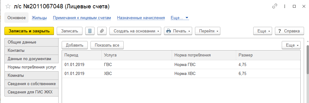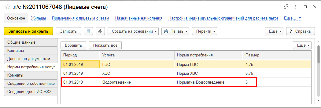 Начисление ХВС и ГВС при отсутствии действующего счетчика производится по нормативу потребления. Нормативы установлены на лицевой счет: