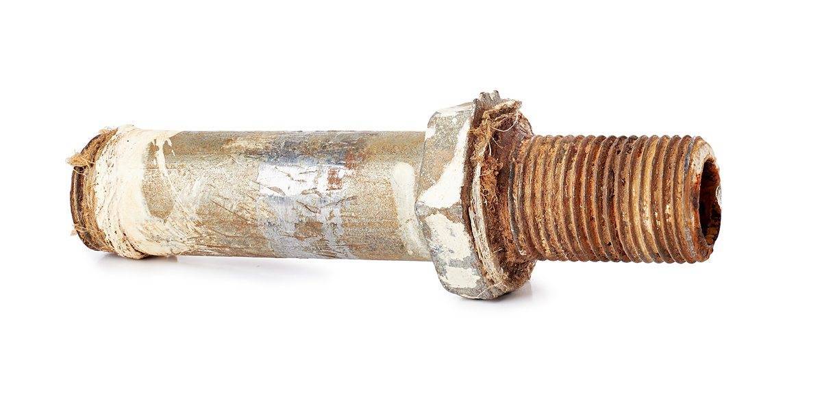 - Удалите с резьб остатки спрессованной подмотки (обычно старые резьбы подмотаны пропитанным свинцовым суриком сантехническим льном). Это можно сделать плоской отверткой или ножом;