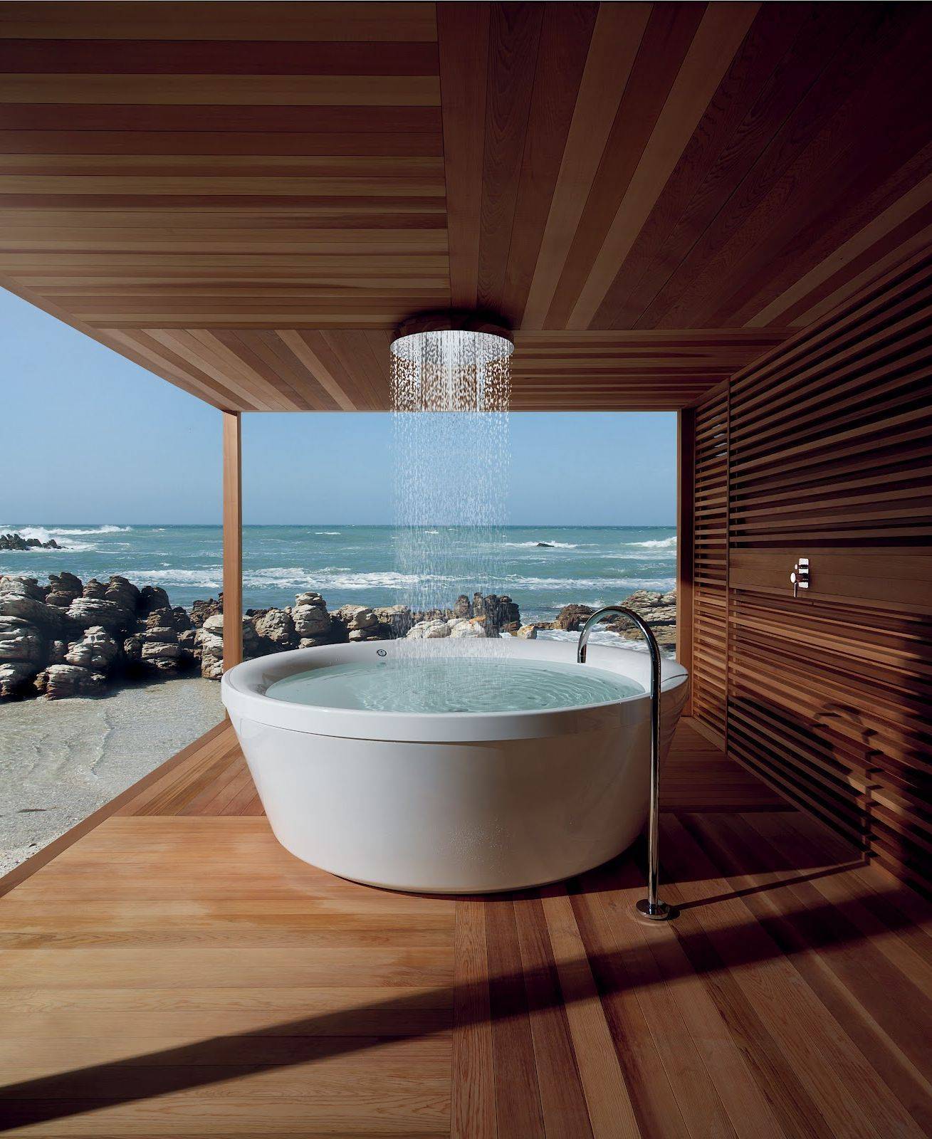 Дизайн такой душевой позволит не только освежиться в жаркий летний день, но и доставит эстетическое удовольствие
