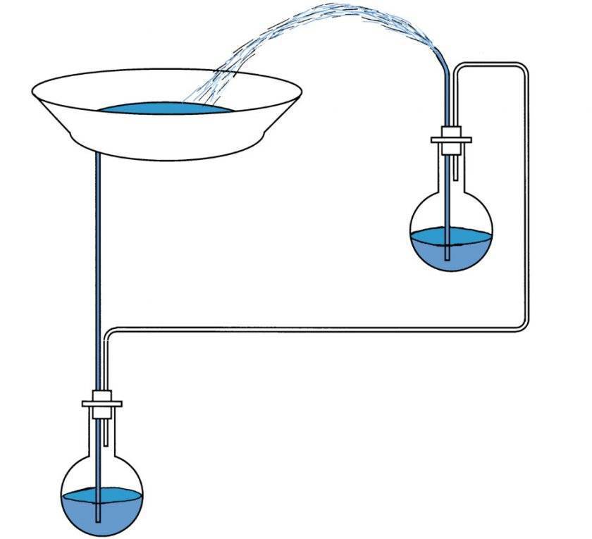 - вода из верхней чаши попадает в нижнюю бутылку, выталкивая воздух во вторую емкость;